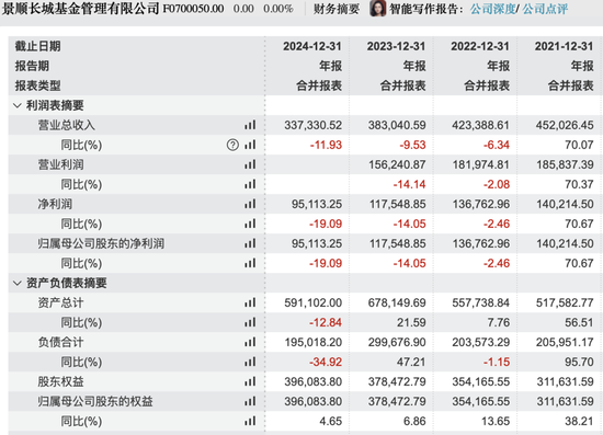 具体来看,2021年景顺长城营收与净利润分别为45.2亿元和14.02亿元,同比增幅均超过70%。但自2022年起,公司经营指标持续承压。至2024年,营收降至33.73亿元,净利润亦回落至9.5亿元,分别较2021年高点下降25.36%与32.25%。